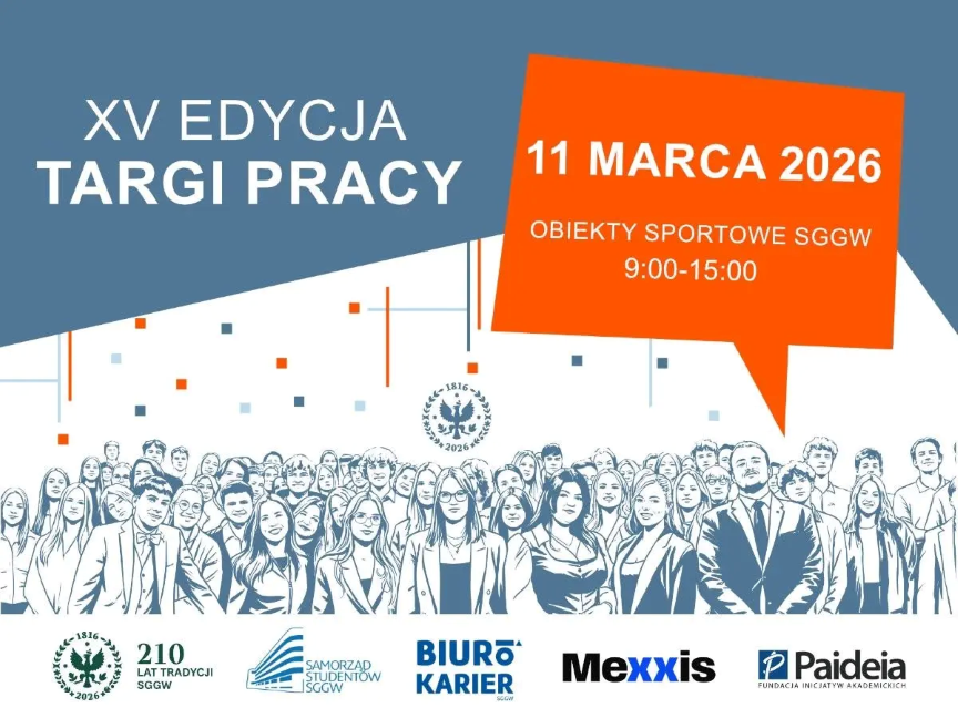 11 marca 2026 r. zapraszamy do udziału w XV jubileuszowej edycji Targów Pracy SGGW organizowanej przez Samorząd Studentów i Biuro Karier Szkoły Głównej Gospodarstwa Wiejskiego w Warszawie.