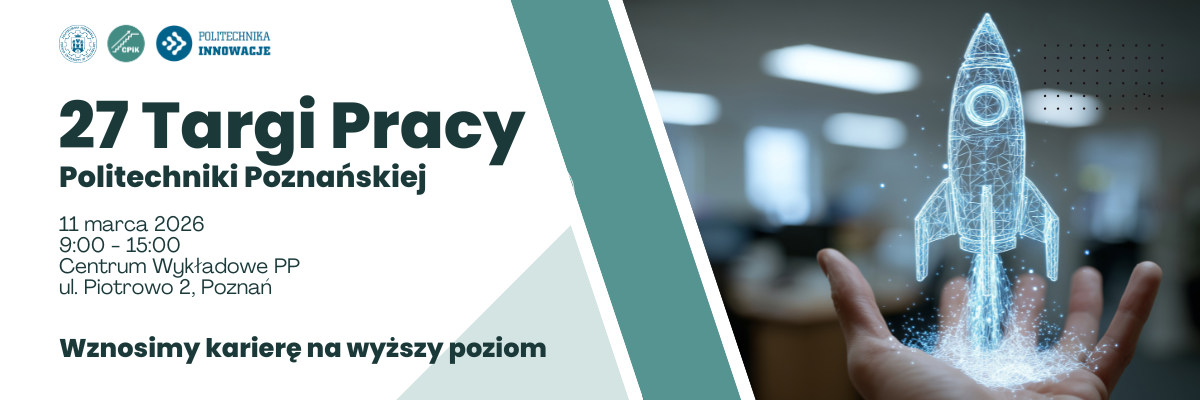11 marca 2026 r., od 9:00 do 15:00, Politechnika Poznańska zaprasza do swojego Centrum Wykładowego, przy ul. Piotrowo 2 w Poznaniu, na doroczne, tym razem już 27-te Targi Pracy. Organizatorami wydarzenia będą Centrum Praktyk i Karier Politechniki Poznańskiej oraz Politechnika Innowacje Sp. z o.o.